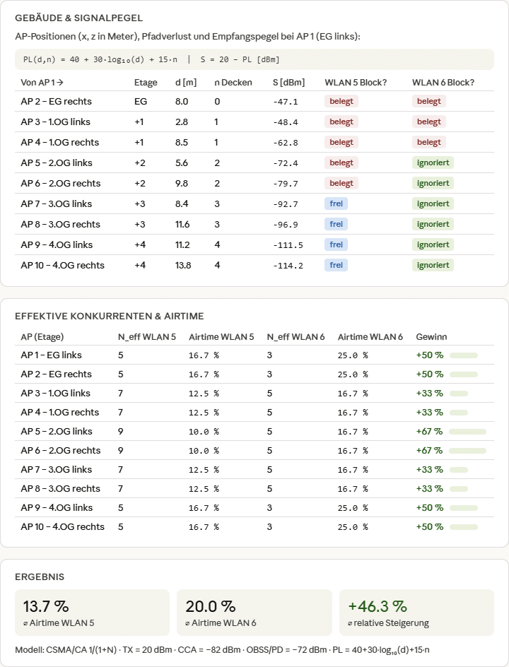 Das Ergebnis in der Praxis: In einem Mehrfamilienhaus mit zehn WLAN-6-Netzen kann jedes Netz deutlich mehr Zeit aktiv senden, weil schwache Signale fremder Netze nicht mehr automatisch zum Stillstand zwingen. Die effektive Airtime pro BSS steigt, auch wenn die physikalische Interferenz dieselbe bleibt (bis zu 46,3%, Berechnung folgt).